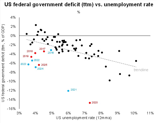 With national debt now closing in on $38 trillion, Macquarie’s research found that since 2018, governments (irrespective of party) have added to the deficit at greater levels than the historical average under similar economic conditions. Plotting the U.S. unemployment rate against the federal deficit as a percentage of GDP, Macquarie found that historically an unemployment rate of approximately 5% would result in a -1% change to the deficit. This pre-2018 correlation tracks steadily downward as unemployment rises, with an 8% unemployment rate resulting in a -4% change to the deficit.