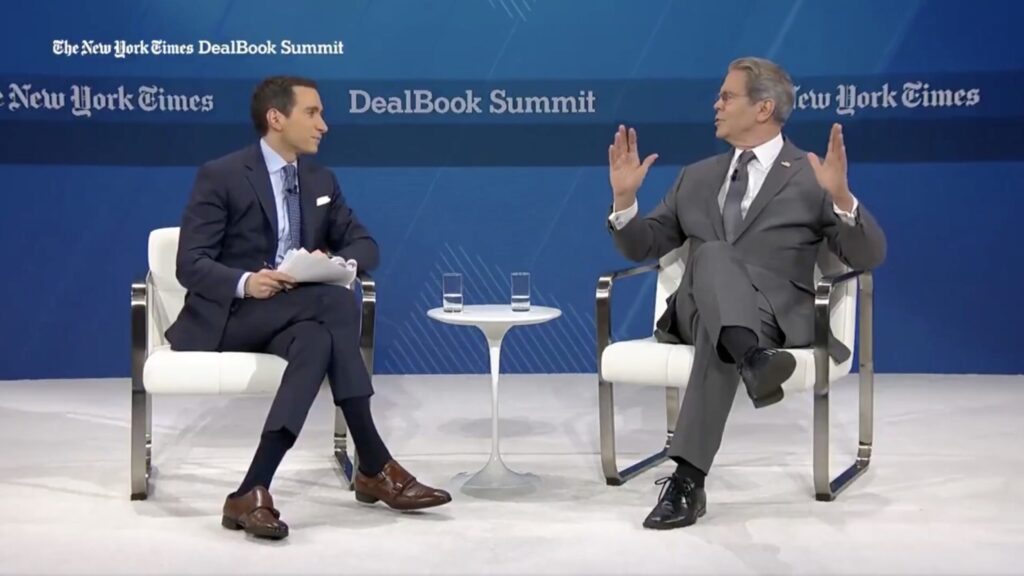 Treasury Secretary Scott Bessent confronts New York Times columnist Andrew Ross Sorkin on stage at the New York Times DealBook…