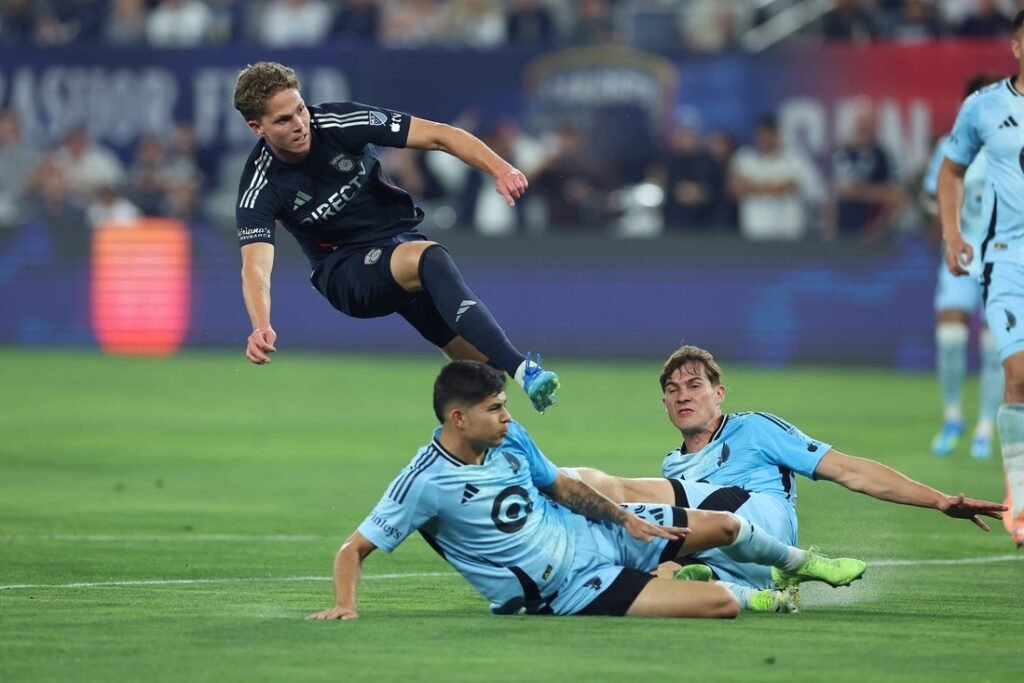 Apr 11, 2026; San Diego, California, USA; San Diego FC midfielder Onni Valakari (8) shoots against the Minnesota United FC…