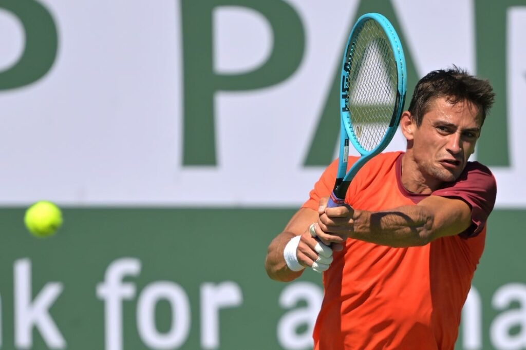 Mar 4, 2026; Indian Wells, CA, USA; Mariano Navone (ARG) hits a shot against Marcos Giron (USA) in his first…