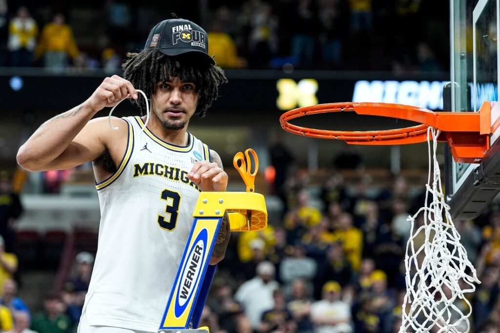 Michigan guard Elliot Cadeau (3) cuts down net to celebrate 95-62 win over Tennessee at the NCAA Tournament Midwest Regional…