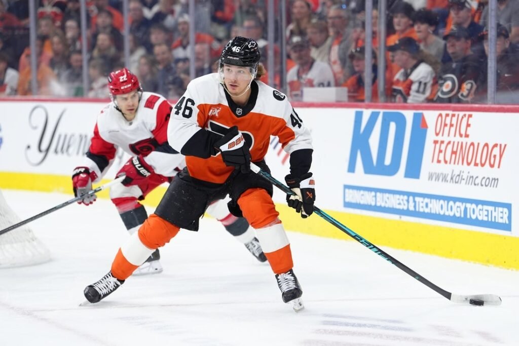 Apr 13, 2026; Philadelphia, Pennsylvania, USA; Philadelphia Flyers center Trevor Zegras (46) controls the puck against the Carolina Hurricanes in…