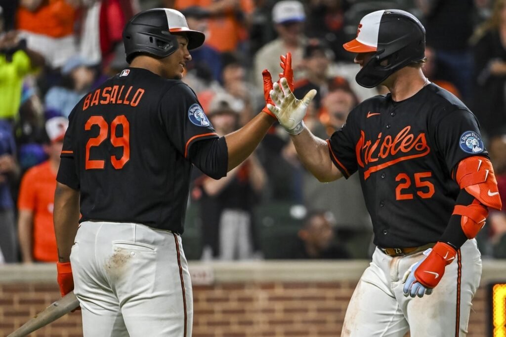 Apr 13, 2026; Baltimore, Maryland, USA; Baltimore Orioles first baseman Pete Alonso (25) celebrates with catcher Samuel Basallo (29) after…