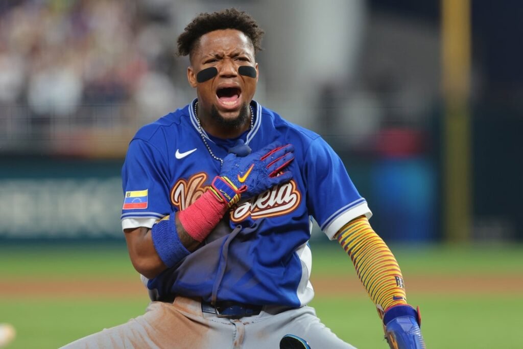 Mar 16, 2026; Miami, FL, United States; Venezuela outfielder Ronald Acuña Jr. (21) reacts after sliding into third base in…