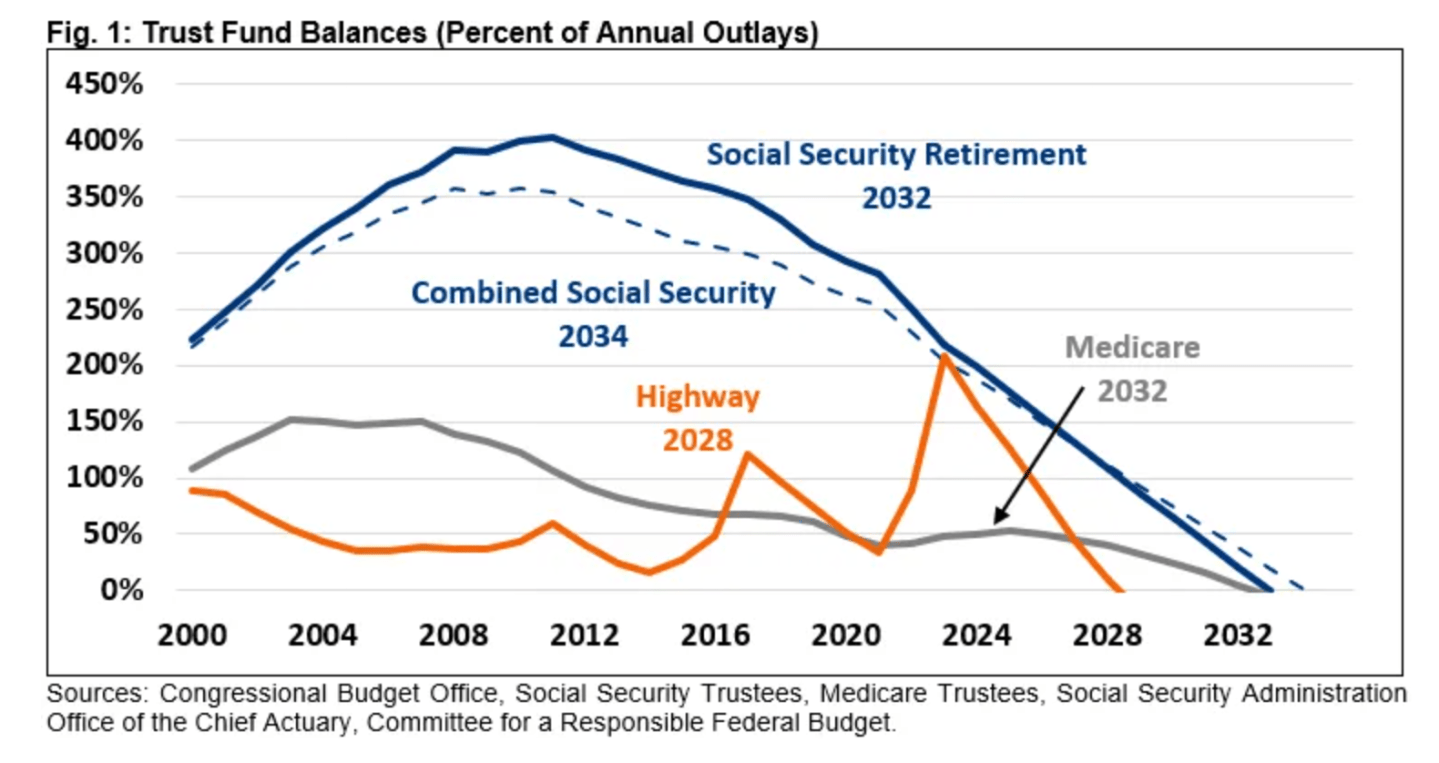 Financial projections from both program trustees and the Congressional Budget Office (CBO) paint an alarming picture, the CRFB says: the trust funds that finance Social Security’s retirement program, Medicare’s hospital insurance, and the Highway Trust Fund will all be depleted by or before 2032.